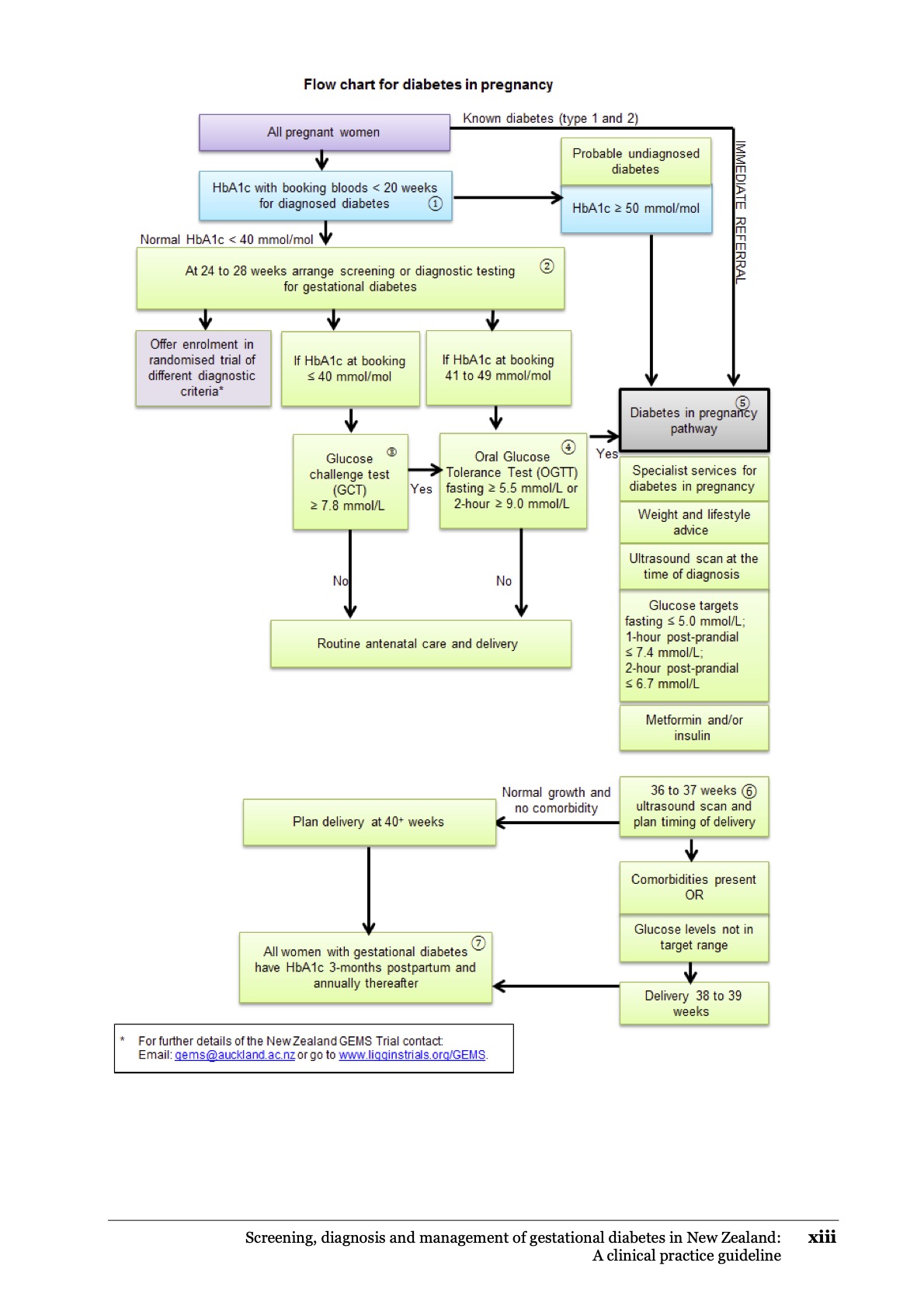 All pregnant women without diabetes should have either a 50 g glucose challenge test (if booking HbA1c ≤ 40 mmol/mol ) or a 75 g glucose tolerance test (if booking HbA1c 41 -49 mmol/mol) between 24-28 weeks gestation to determine whether they have gestational diabetes (GDM) as per guidelines